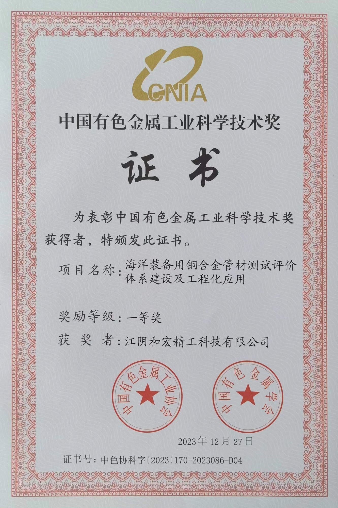 2024-04-08 近日,由国标(北京)检验认证有限公司牵头推荐,国合通用测试评价认证股份公司、北京科技大学、江阴和宏精工科技有限公司、浙江海亮股份有限公司、中色创新研究院(天津)有限公司、中国合格评定国家认可中心、上海交通大学以及华北电力大学联合申报的2023年度中国有色金属工业科学技术奖项目——“海洋装备用铜合金管材测试评价体系建设及工程化应用”荣获“中国有色金属工业科学技术奖一等奖”。